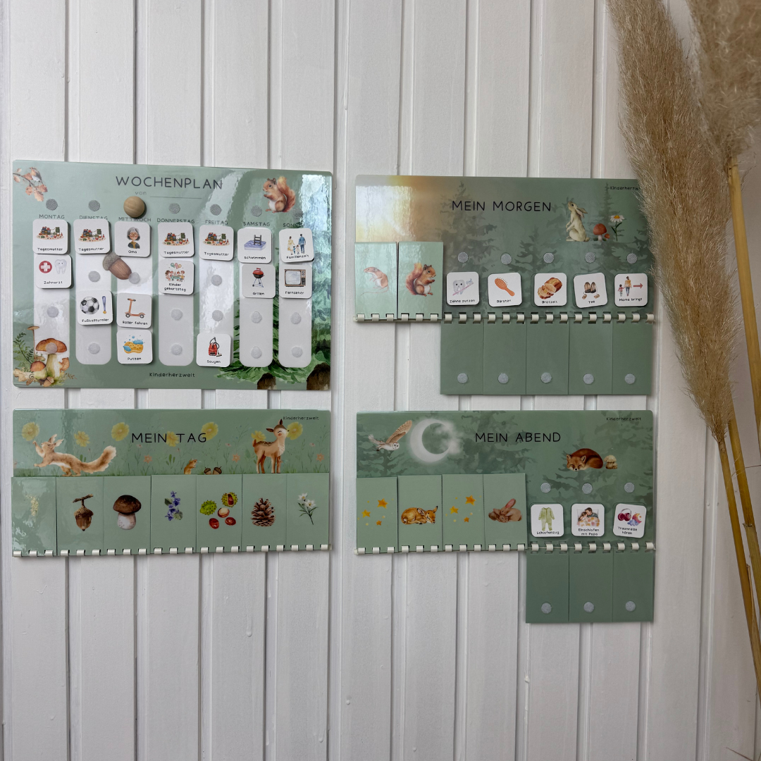 Weil Struktur nicht streng sein muss, sondern Halt geben darf. Das Kinderherzwelt Komplett-Set bringt Ruhe in den Alltag, ohne Druck zu machen. Es hilft euch Abläufe sichtbar zu machen, Übergänge liebevoll zu begleiten und den Tag gemeinsam zu gestalten. Kinder wissen, was kommt und fühlen sich sicher.